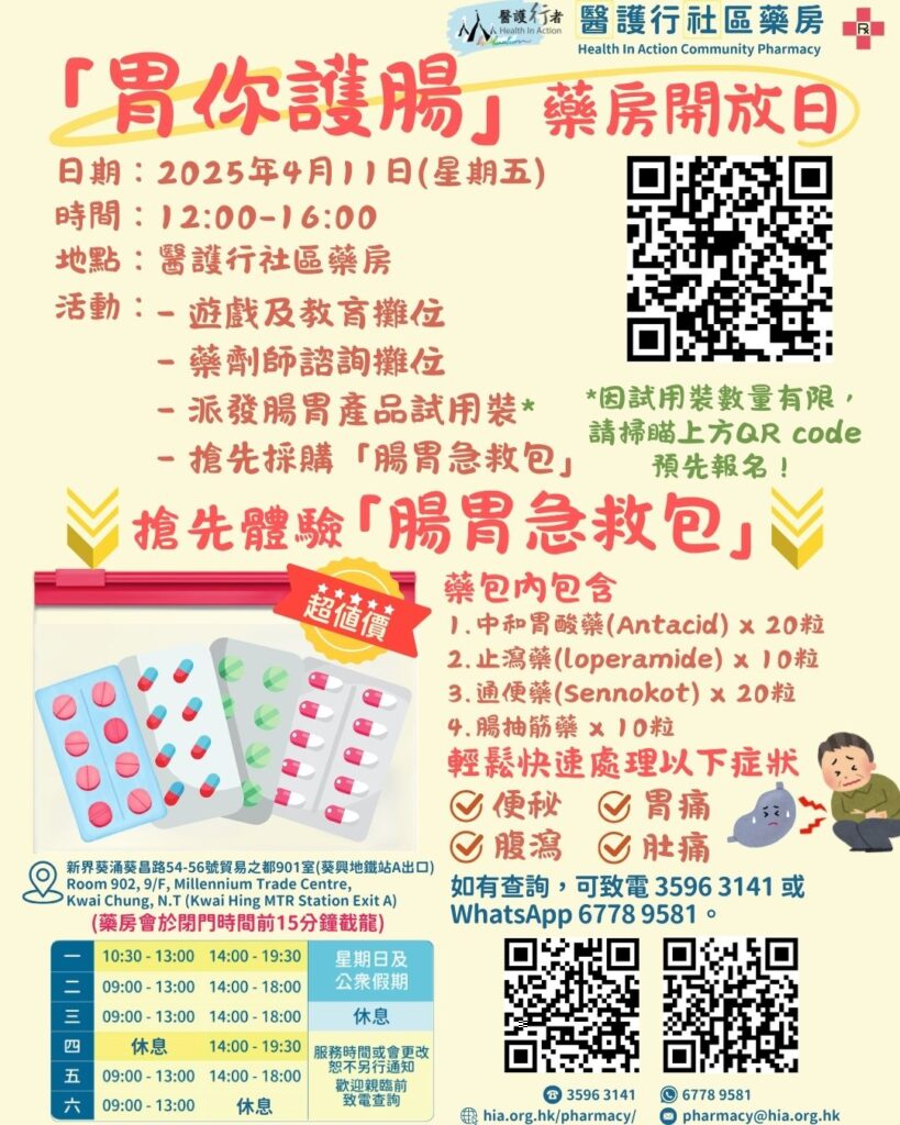 香港人生活節奏急速,工作壓力大🤯,少不免不時都有腸胃困擾。所以!我們藥劑師團隊為大家精選左四款藥物💊,希望可以幫到手快速舒緩四大常見腸胃問題,一PACK在手,幫你以備不時之需!而呢項新產品腸胃急救包即將會於4月11日面世啦🤩到時藥房仲會有腸胃主題嘅開放日💚!現場設有攤位遊戲,仲有贈品派添,當日就可以以❗超級優惠價❗購買我哋嘅腸胃急救包 !提早預約更可獲精美小禮物一份🎁,先到先得、送完即止,有興趣就快D點擊以下連結或者掃QR code報名啦!🌟