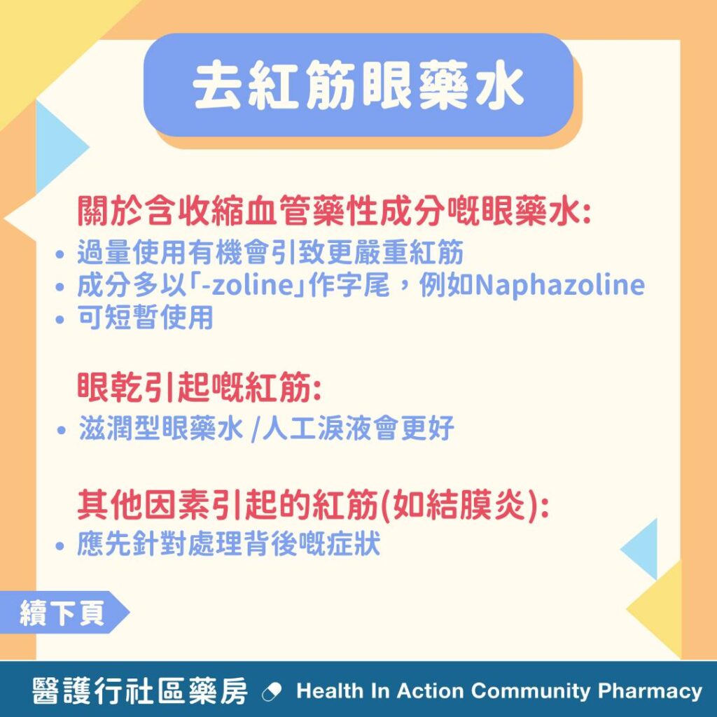 答:唔一定,功能愈多代表成分相對較多,而且並非所有成份都適合長期且頗密使用,例如市面上標榜去紅筋嘅眼藥水,如長期使用有可能會引致更嚴重嘅紅筋,陷入惡性循環😱。呢類成分多以「-zoline」作字尾,例如Naphazoline。如遇上拍照、宴會等重要場合,想極速消除紅筋,可短暫使用有去紅筋成分嘅眼藥水急救用🚨。另需注意含類固醇嘅眼藥水,長期使用會造成眼壓過高,甚至視力受損,導致青光眼等嚴重後果👀。