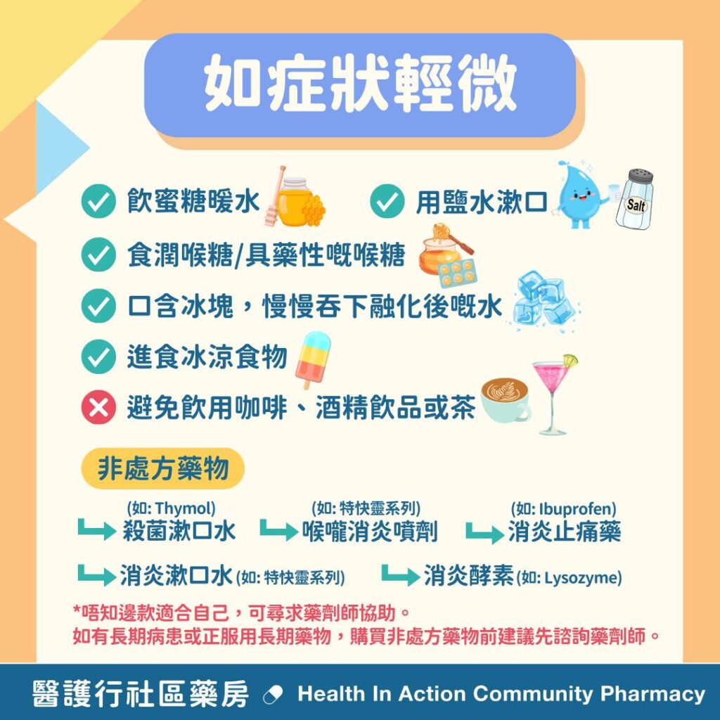 亦可考慮配備非處方藥物舒緩喉嚨炎症及痛楚: