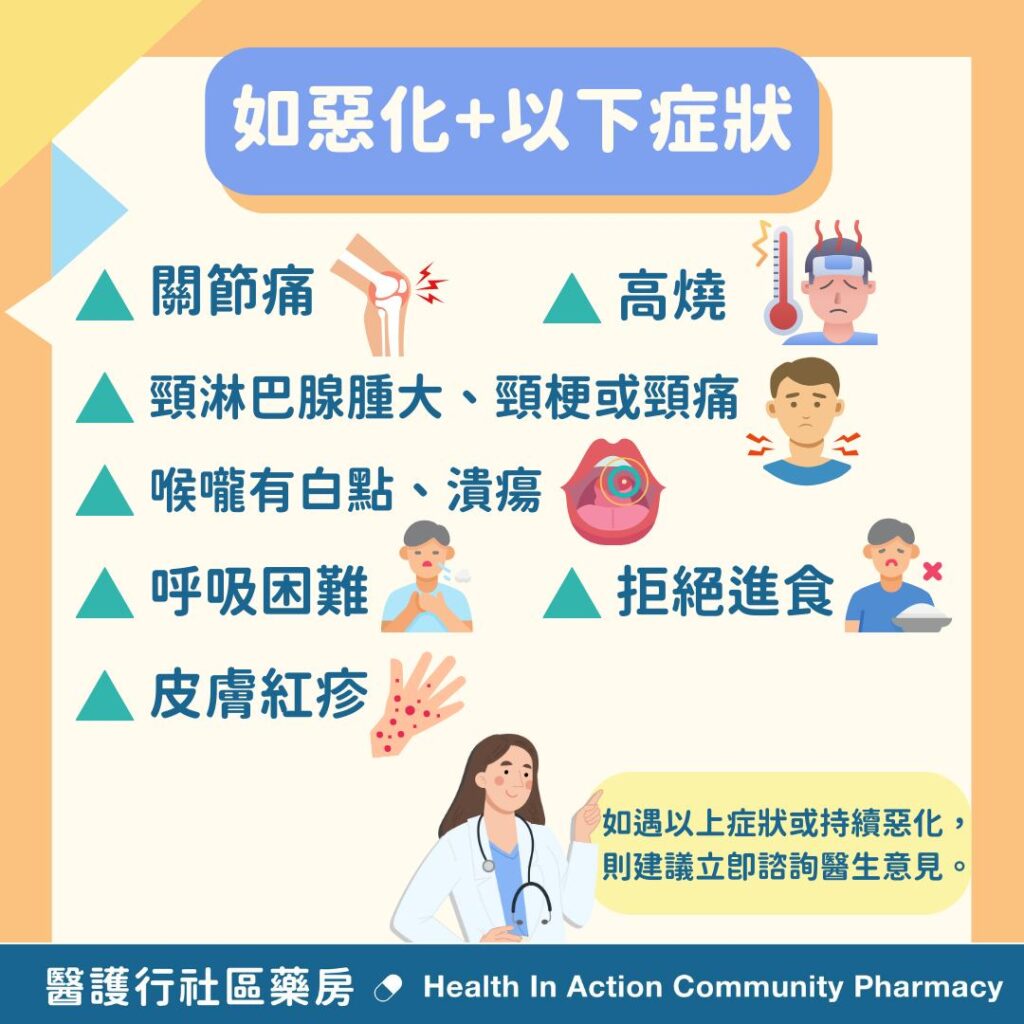 如症狀持續並持續惡化,並伴隨着以下症狀,建議立即諮詢醫生: