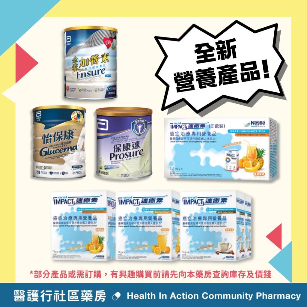 本藥房最近推出多款牌子嘅營養產品🥳🥳,配合埋全新嘅營養產品點心紙,所有營養產品一目了然👀。🔎全新產品包括覆蓋全面均衡營養嘅營養粉、癌症治療專用而設嘅營養品、適合關注血糖人士嘅即飲裝、適合洗腎人士嘅蛋白配方等,為唔同人士提供選擇。
