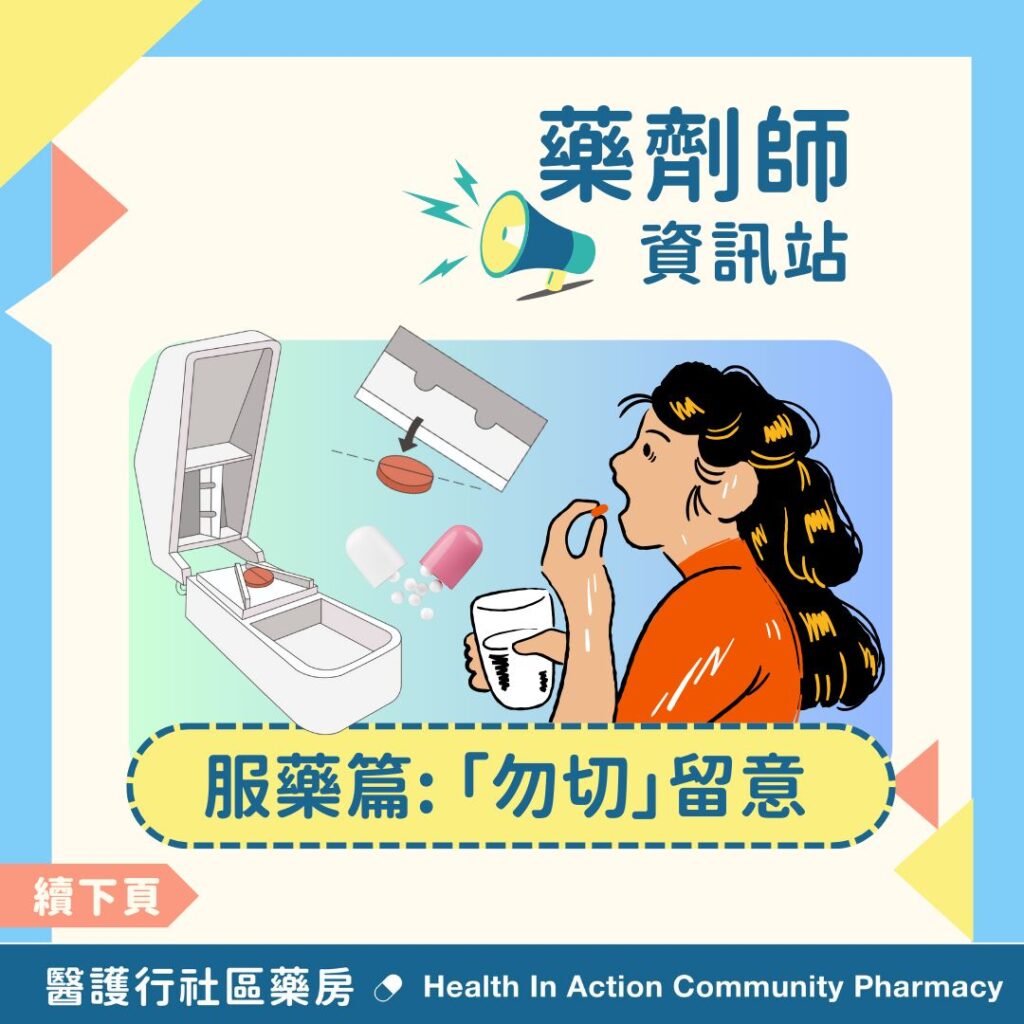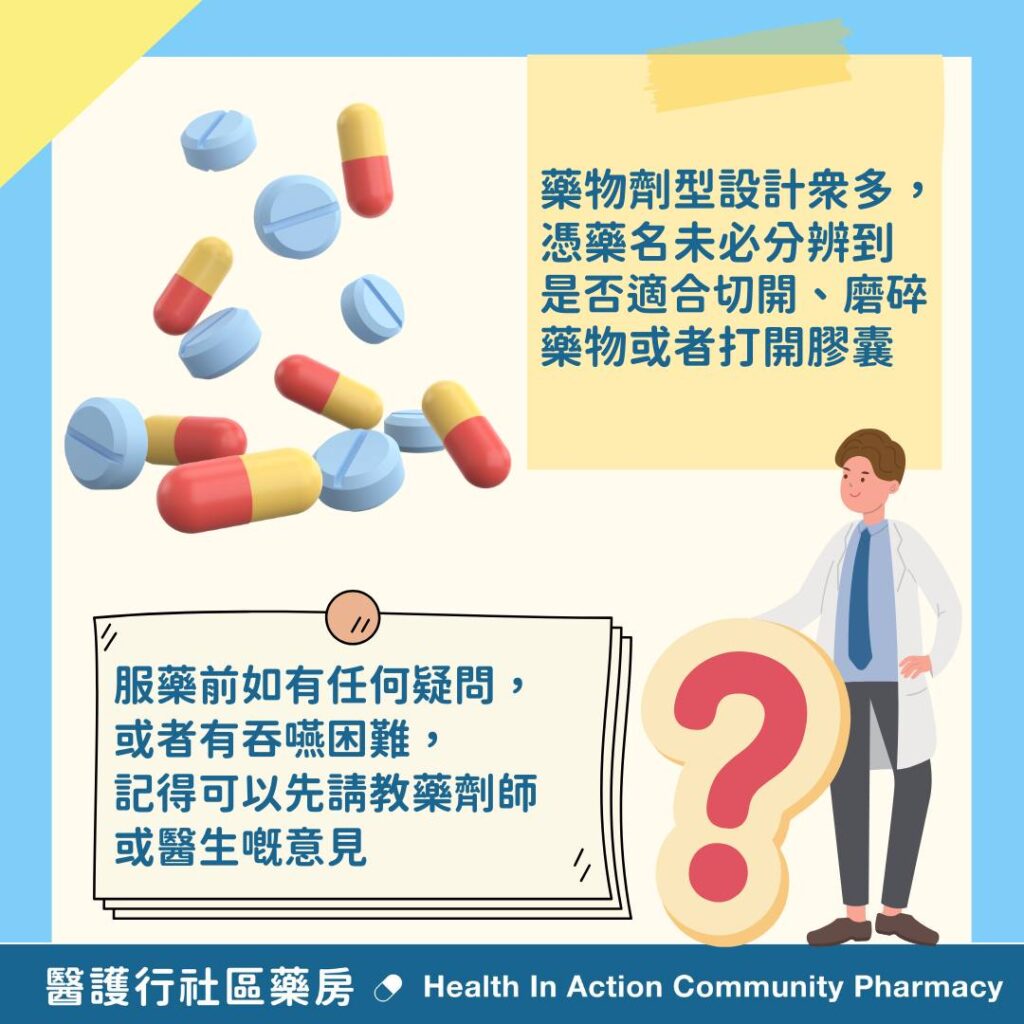 由於藥物嘅劑型設計眾多,加上不時有新研發嘅劑型推出市場,有時憑藥名都未必分辨到是否適合切開、磨碎藥物或者打開膠囊。服藥前如果有任何疑問❓,或者有吞嚥困難,記得先請教藥劑師或醫生嘅意見。