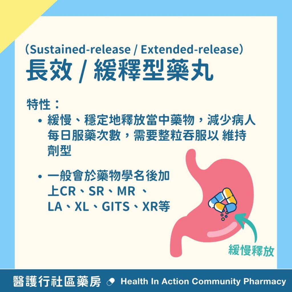 長效 / 緩釋型藥物: 一般會於藥物學名後加上CR (Controlled-release)、SR (Sustained-release)、MR (Modified-release)、LA(Long-acting)、XL、GITS、XR等