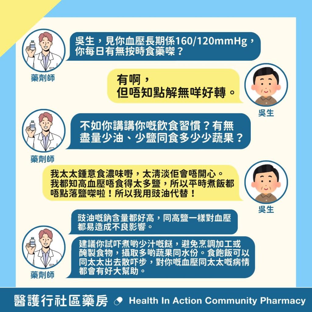 藥劑師:「豉油嘅鈉含量都好高,同高鹽一樣對血壓都易造成不良影響🙅🏻♂️。建議你試吓煮啲少汁嘅餸,避免烹調加工或醃製食物,攝取多啲蔬果同水份。食飽飯可以同太太出去散吓步👫🏻,對你嘅血壓同太太嘅病情都會有好大幫助㗎。」