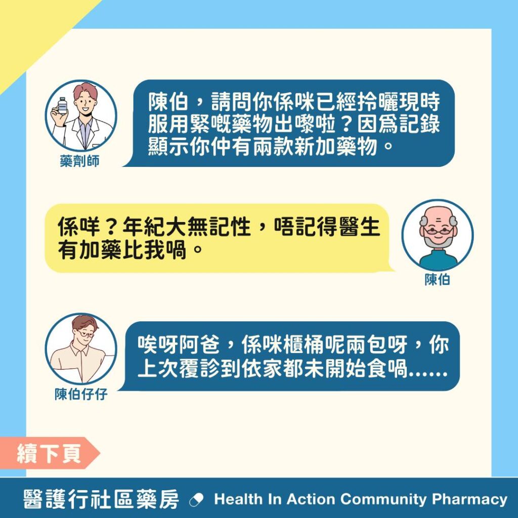 🧑🏻⚕藥劑師:「陳伯,請問你係咪已經拎曬現時服用緊嘅藥物出嚟啦?因為記錄顯示你仲有兩款新加藥物。」