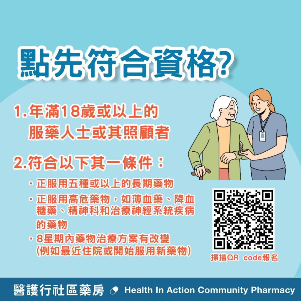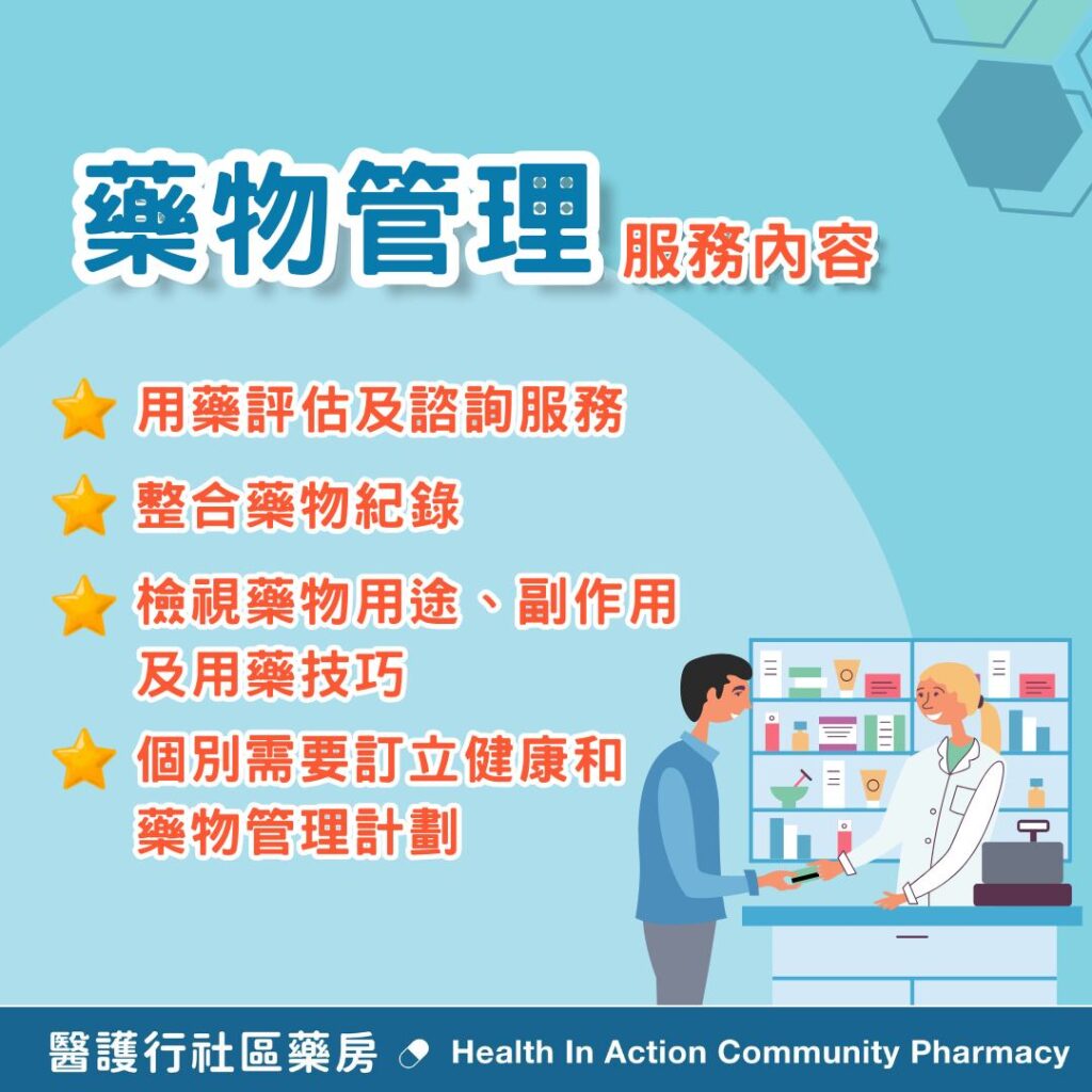 答:呢項服務係針對長期服藥人士💊同其照顧者,由本藥房嘅藥劑師🩺提供専業嘅藥物咨詢服務,服務內容包括: