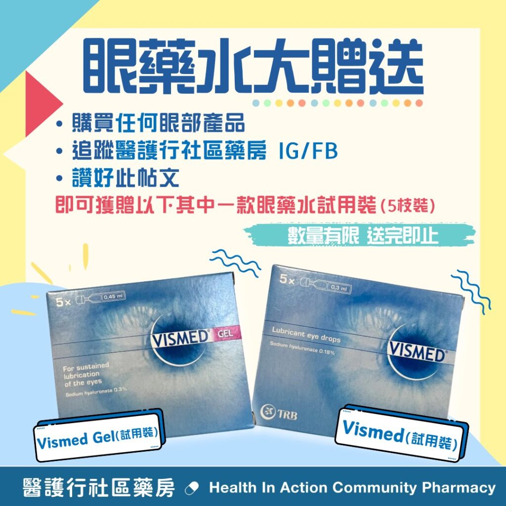 為咗鼓勵大家多啲關注眼仔健康,本藥房決定推出另一產品優惠,做齊指定步驟就可以換領到Vismed獨立包裝 (5枝裝) 嘅眼藥水啦!