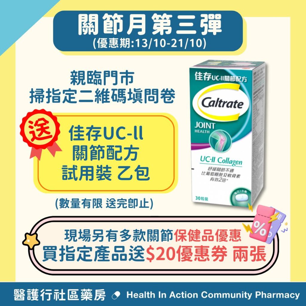 凡於13/10至21/10期間親臨門市,並於現場填寫指定問卷,即送你「佳存UC-ll關節配方」試用裝 乙包(7粒,一星期份量)。