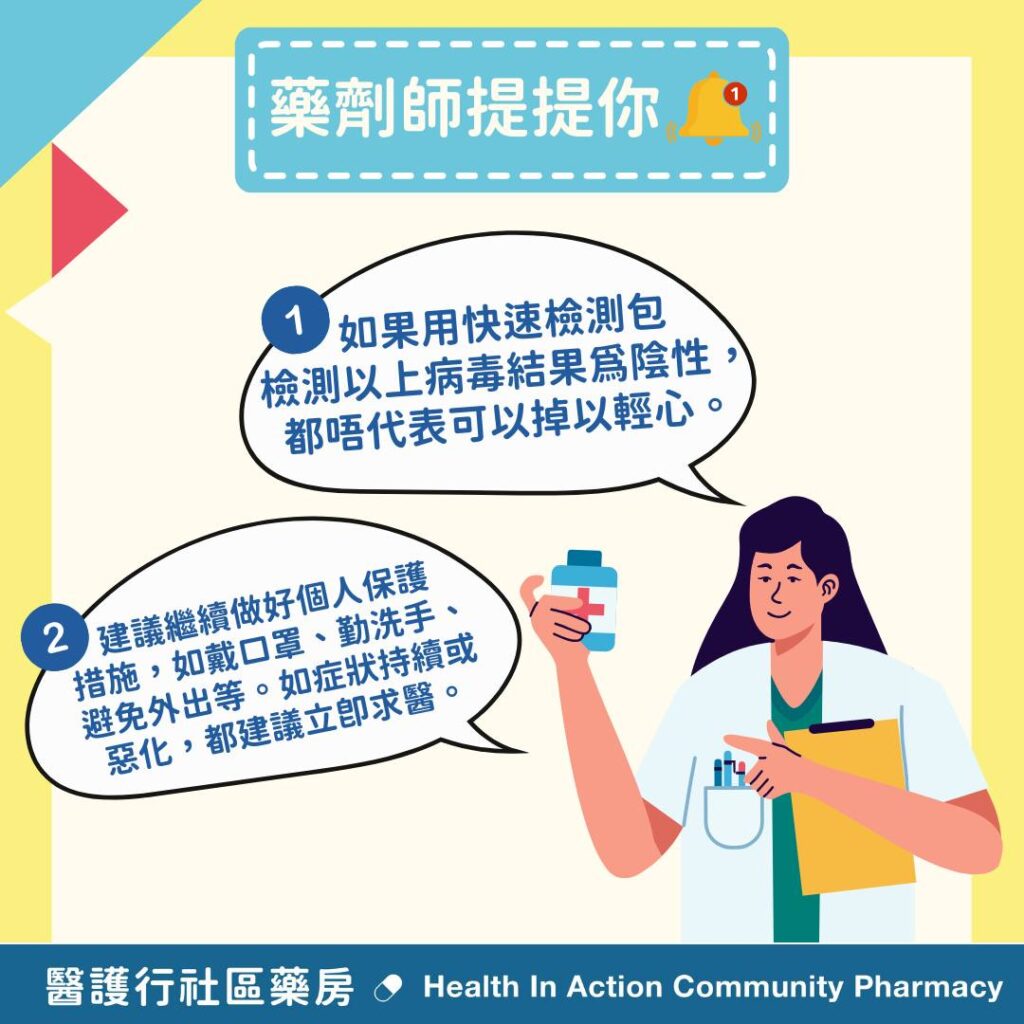 如利用快速檢測包檢測以上病毒結果為陰性,都唔代表可以掉以輕心,反而更應該做好個人保護措施,如戴口罩、勤洗手、避免外出等。如症狀持續或惡化,都建議立即求醫👨🏻⚕️👩🏻⚕️。