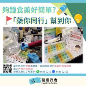 有一位80多歲的獨居老人,患有幾種慢性病,每日都需要服用10多種藥物。每隔一段時間,老人家就會攜帶一大包藥物外出,由社福機構義工陪同到醫護行社區藥房整理藥丸盒 …